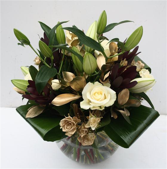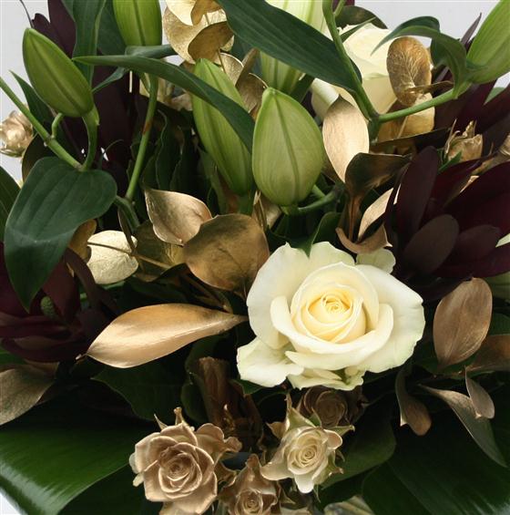 A festive warm toned hand tied bouquet with a mix of gold sparkle, dark red with white roses, oriental lilies and foliage.