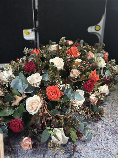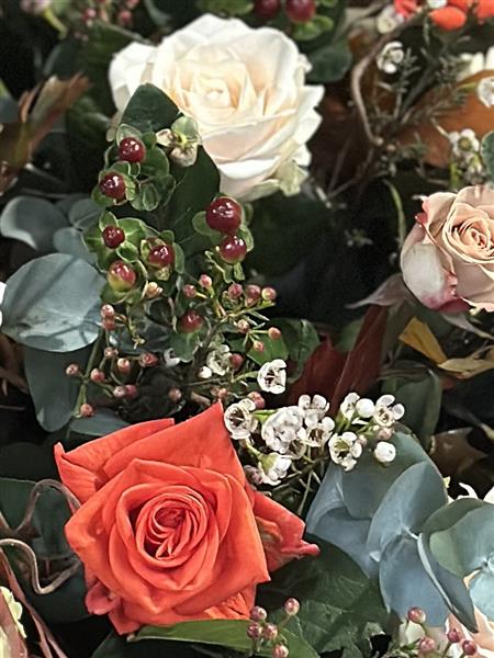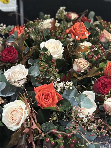 A mix of orange, red and cream roses, berries, eucalyptus and autumnal foliage, pretty wooded stemmed wax flower and twisted willow