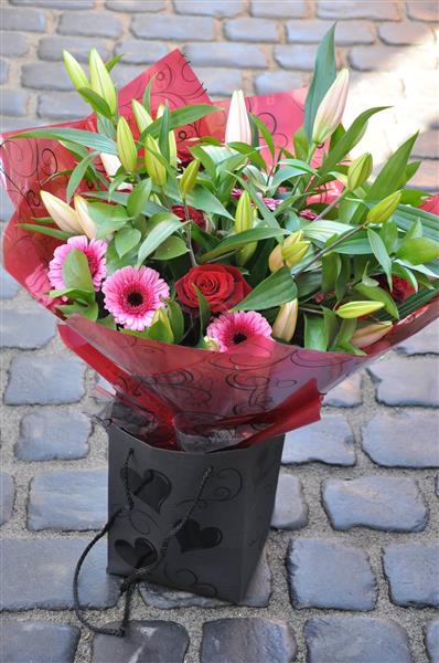 Pink Gerber red roses and pink Lillys with foliage make a lovely combination.
