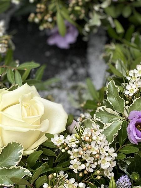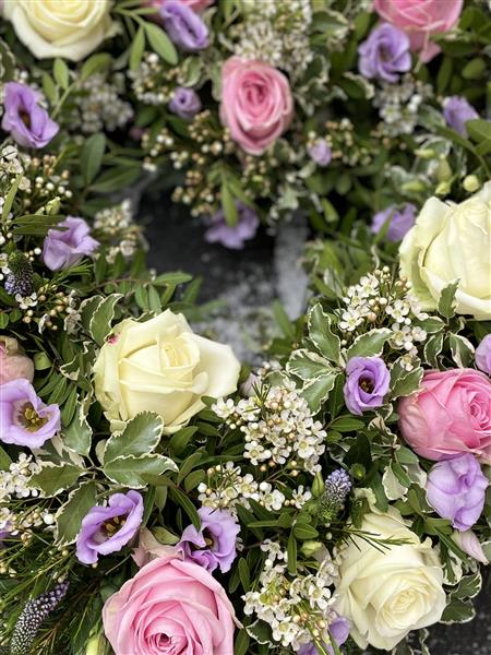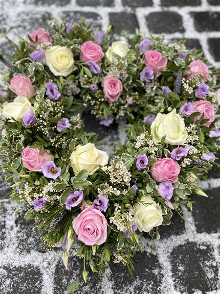 Pastel shades with variegated foliage make this loose country style open heart shape it’s a very pretty heart.