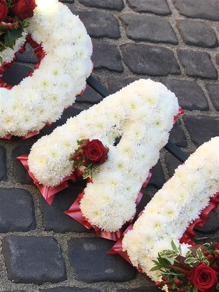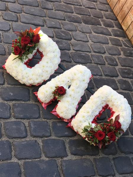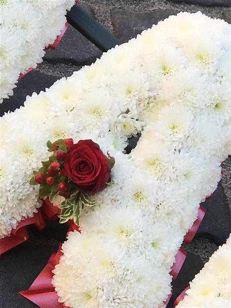 White Chrysanthemums cover each letter. A pretty spray of flowers are arranged on the first and last letters. A pleated ribbon is the frame around each letter. There is the option to change the ribbon colour to your own choice and the flower colour in the spray can match this.