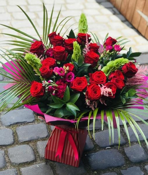 Hand tied bouquet of ruby red roses finished with a collar of exotic leaves.