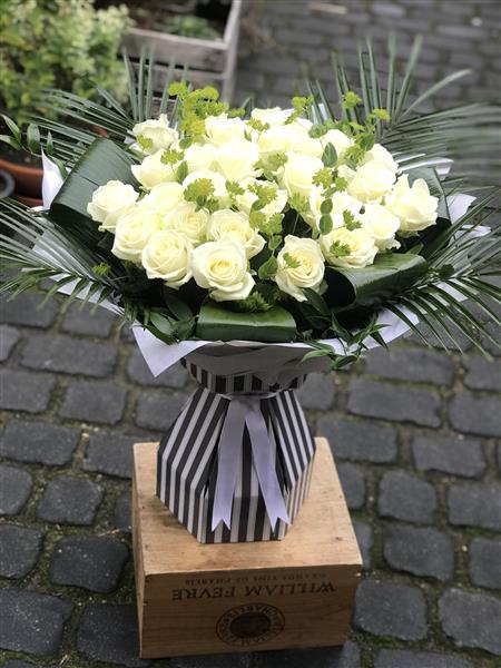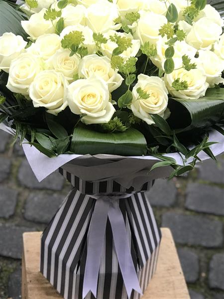 Hand tied bouquet, of the stunning White Avalanche Roses finished with a collar of exotic leaves.
