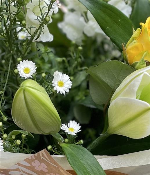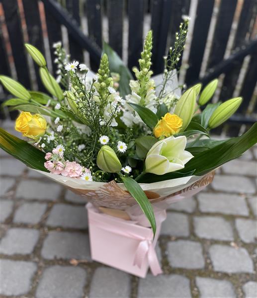 Yellow Roses, Lillys with complimenting seasonal flowers.