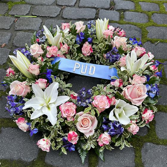 White lillies pink roses and blues, he letters on the ribbon is optional as is the colour of the ribbon, please mention in notes any word you would like adding or call or email to confirm..