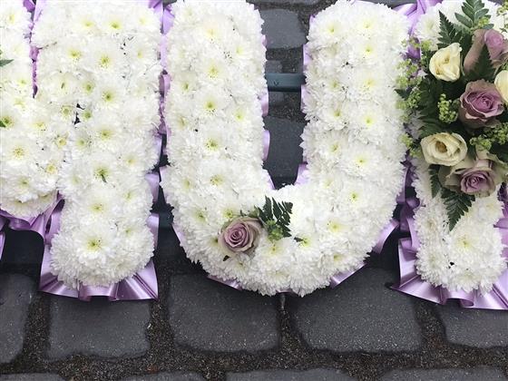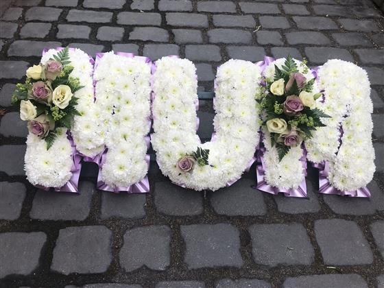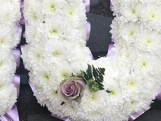 White Chrysanthemums cover each letter. A pretty spray of flowers are arranged on the first and last letters. A pleated ribbon is the frame around each letter. There is the option to change the ribbon colour to your own choice and the flower colour in the spray can match this.