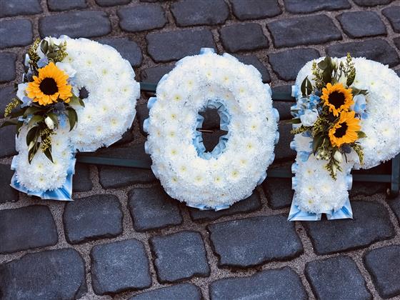 White Chrysanthemums cover each letter. A pretty spray of flowers are arranged on the first and last letters. A pleated ribbon is the frame around each letter. There is the option to change the ribbon colour to your own choice and the flower colour in the spray can match this.