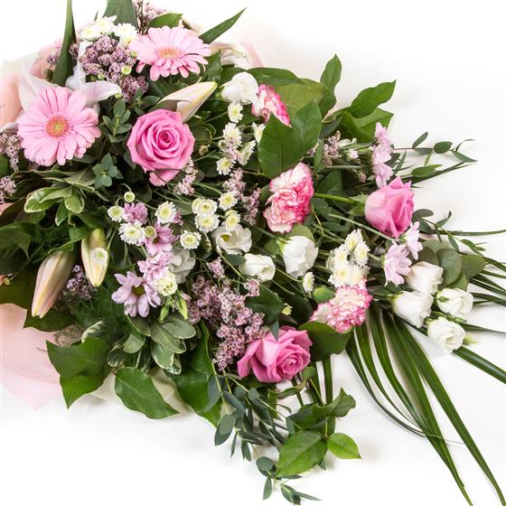 A traditional open sheaf tribute in whites and pinks, including roses, chrysanthemums and delicate limonium.