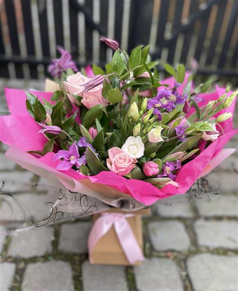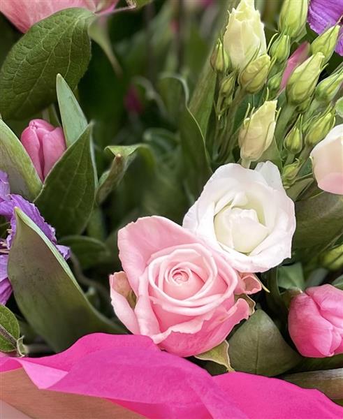Hand tied bouquet of pink tulips and roses plus seasonal filler flower.