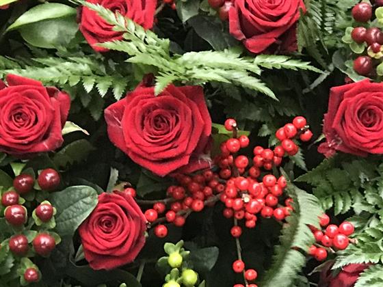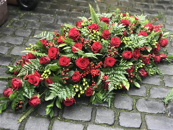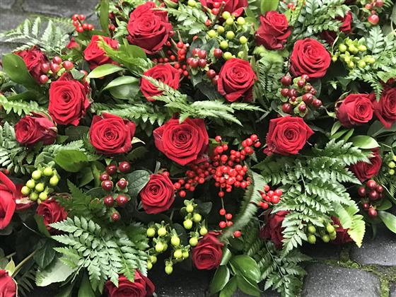 Rea Roses and lots of them with complimenting filler flowers and foliage make this a classic tribute with elegance and love.