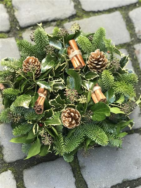This wreath makes a perfect memorial tributes or alternatively can be used as a table decoration as the materials are arranged into an oasis foam which can be re dampened. They look very effective with a 4 inch cylinder vase in the centre holding a candle for ambience.