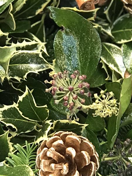 A 12” Christmas Wreath in mixed festive foliage with natural decorations. The fir cones are sprayed gold and the overall wreath has a light misting of Gold Glitter spray.