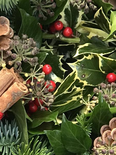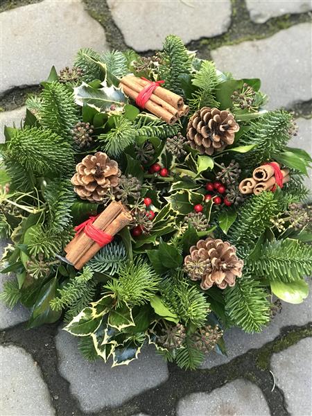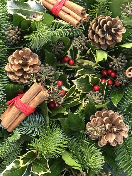 A 12” Christmas Wreath in mixed festive foliage with natural decorations like fir cones, red berries and red ribbon tied cinnamon sticks.