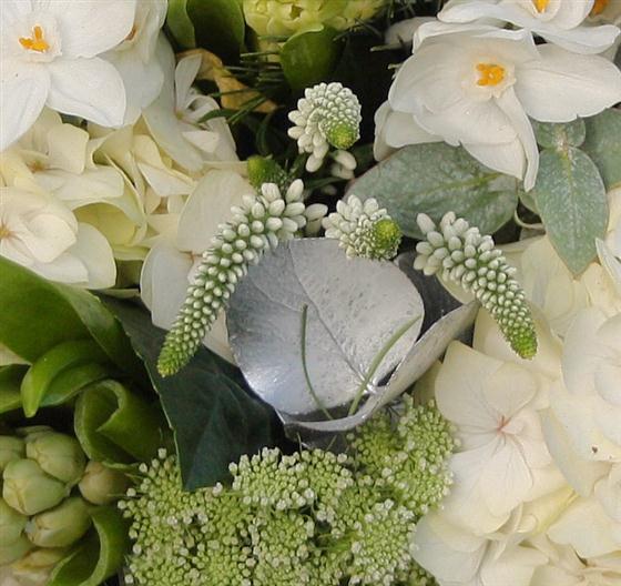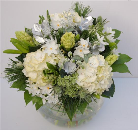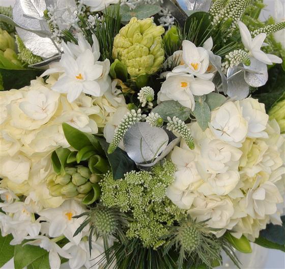 An opulent array of seasonal blooms including hydrangea, jonquils and eryngium with hints of silver.