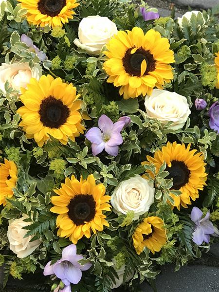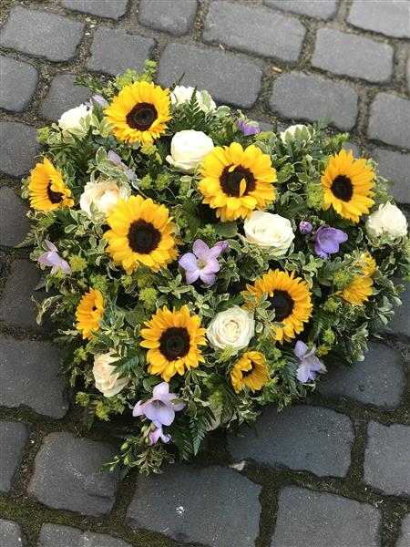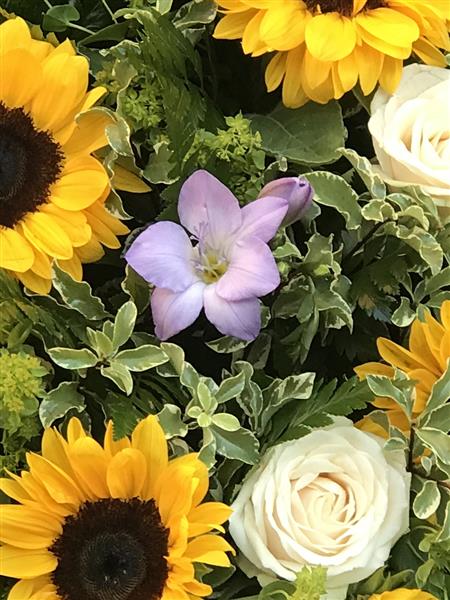 A full heart of Sunflowers, white roses and lilac freesias with mixed seasonal foliage.