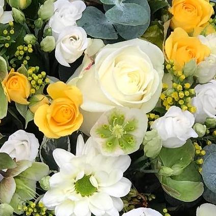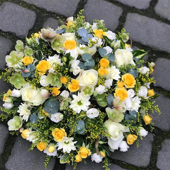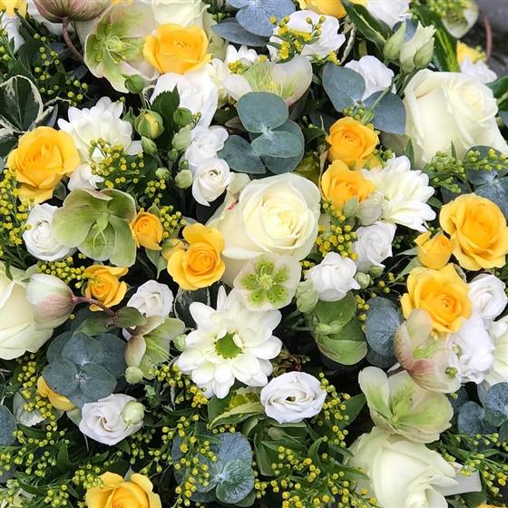 A gorgeous mix of yellows whites and greens with mixed foliages make a beautiful sunshine tribute.