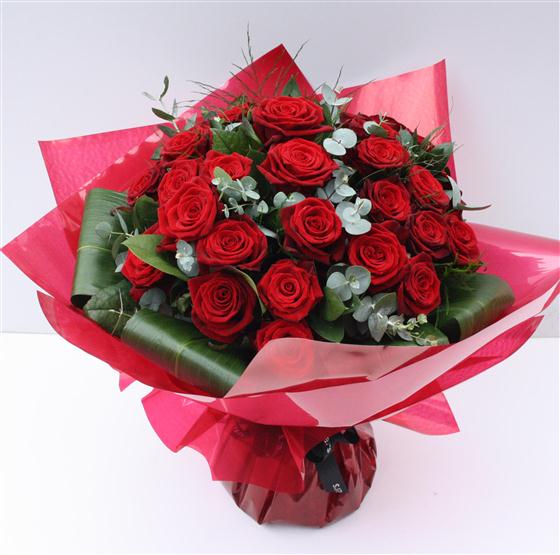 A gesture of love, this stunning bouquet of twenty four velvety, long stemmed red roses is a real show stopper.