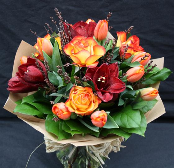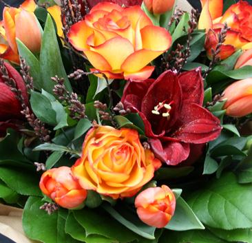 A warming shaded bouquet with orange /gold shades and deep red Amaryllis (please note the amaryllis will come in bud and open in time)