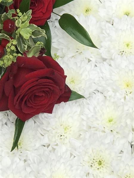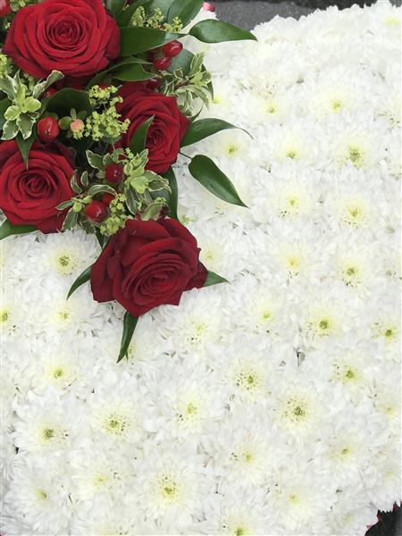 A full heart with a blanket of white Chrysanthemum. The spray on this design ir in red roses and hypericum berries, there is a pleated red ribbon edging.